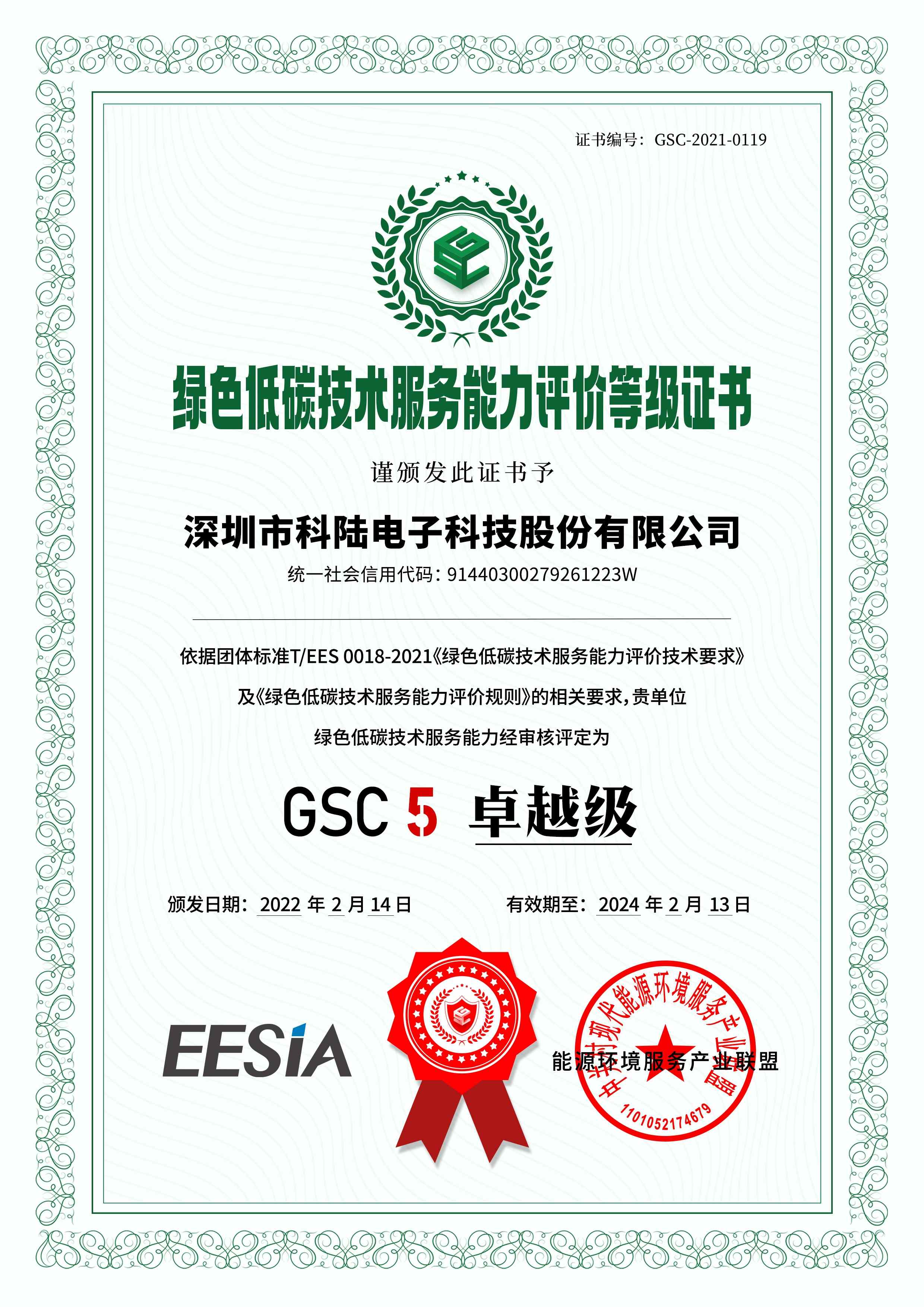 近日,能源環境服務產業聯盟(EESIA)發布了首批綠色低碳技術服務能力評價結果,深圳市科陸電子科技股份有限公司(以下簡稱科陸)成功獲評綠色低碳技術服務能力GSC5(卓越級)單位。